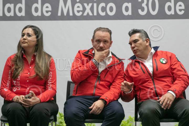 CIUDAD DE MÉXICO, 30ABRIL2024.- Cynthia López Castro, candidata al Senado por la Coalición Fuerza y Corazón por México; Santiago Taboada, candidato a la Jefatura de Gobierno por la Coalición Fuerza y Corazón por México, y Alejandro Moreno Cárdenas, líder nacional del PRI, durante el banderazo de salida de las brigadas de activistas de promoción del voto del PRI. FOTO: MOISES PABLO/CUARTOSCURO.COM