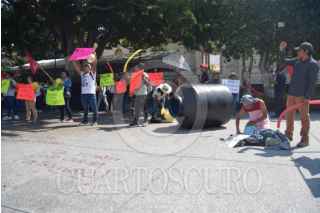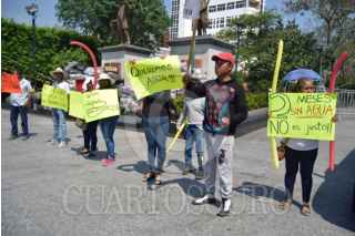 CHILPANCINGO, GUERRERO, 30ABRIL2024.- Integrantes del Movimiento Antorcha Campesina y vecinos de por lo menos 80 colonias de la capital, protestaron en la Plaza Cívica "Primer Congreso de Anáhuac" de Chilpancingo, para exigir al gobierno municipal y la Comisión de Agua Potable y Alcantarillado de Chilpancingo (Capach), el suministro de agua potable en sus hogares. Alrededor de las 10:00 de la mañana, unas 60 personas, provenientes de las diferentes colonias de la capital, así como integrantes del Movimiento Antorcha Campesina, arribaron a la plancha del zócalo capitalino, justo frente al H. Ayuntamiento municipal, protestaron en la exigencia del vital líquido. Con ayuda de pancartas, un Rotoplas vacío, jóvenes semidesnudos y solo cubiertos con una toalla, otros más tirando su ropa en el suelo o llevando sus trastes sucios, fue como exigieron una pronta solución a esta gran problemática que está afectando a toda la ciudad. FOTO: DASSAEV TÉLLEZ ADAME/CUARTOSCURO.COM