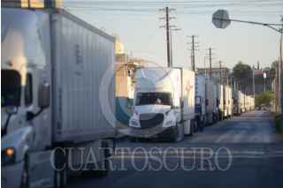 CIUDAD JUÁREZ, CHIHUAHUA, 30ABRIL2024.- Largas filas de tráileres se observan en el Puente Internacional Zaragoza. Chóferes comentan que ya llevan más de un día y que no avanzan, además de que autoridades no les informan sobre cuando se normalizará el paso de los camiones. FOTO: REY R. JÁUREGUI/CUARTOSCURO.COM