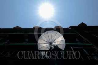 CIUDAD DE MÉXICO, 01MAYO2024.- Un trabajador de las terrazas del Zócalo invita a gente que transita por la plancha a pasar a su restaurante durante un día de intenso calor. FOTO: GALO CAÑAS/CUARTOSCURO.COM