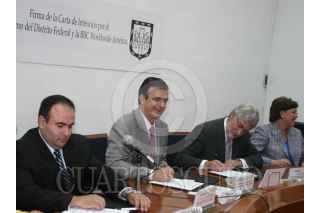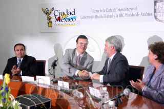 MÉXICO, D.F. 17JULIO2007.- Marcelo Ebrard, jefe de gobierno y representantes de la BBC América durante la firma de la carta de intención para crear nuevo canal de TV digital. FOTO: JAIME WENER/CUARTOSCURO.COM