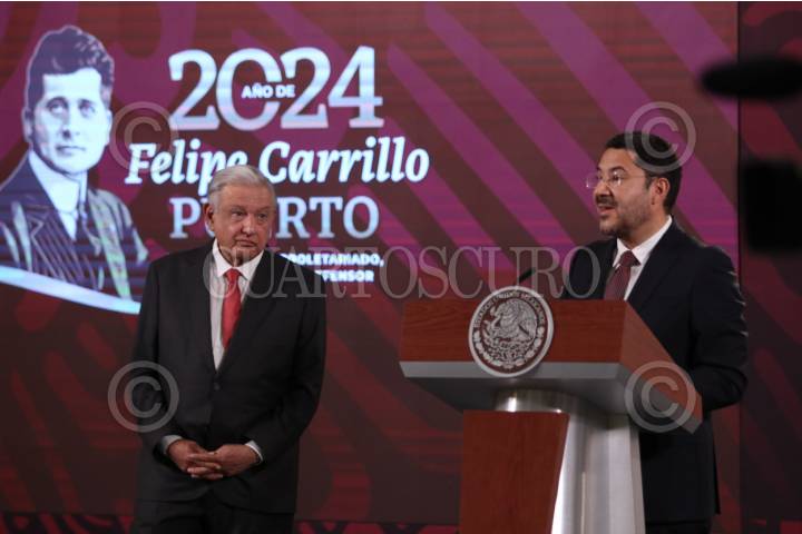 CIUDAD DE MÉXICO, 02MAYO2024.- Andrés Manuel López Obrador, presidente de México acompañado de Martí Batres Guadarrama, jefe de Gobierno durante conferencia en Palacio Nacional. FOTO: ANDREA MURCIA /CUARTOSCURO.COM