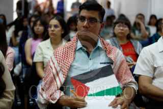 QUERÉTARO, QUERÉTARO, 02MAYO2024.- El embajador de Palestina en México, Mohamed Saadat, impartió la ponencia "Palestina hoy: su historia, su gente y su lucha", junto a la activista por Palestina, la Dra. Ara Galán, como parte de las actividades organizadas por la Licenciatura en Relaciones Internacionales de la Facultad de Ciencias Políticas y Sociales de la Universidad Autónoma de Querétaro. FOTO: CÉSAR GÓMEZ/CUARTOSCURO.COM
