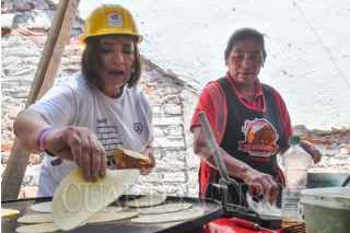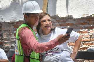 CIUDAD DE MÉXICO, 03MAYO2024.- Xóchitl Gálvez, candidata a la Presidencia de la República por la coalición "Fuerza y Corazón por México" (PAN, PRI y PRD), degusta un taco durante el encuentro con trabajadores de la Construcción, en la calle de Río Guadalquivir 71 a quienes los felicitó en el marco del Día de la Santa Cruz y les compartió sus propuestas de gobierno. FOTO: MARIO JASSO/CUARTOSCURO.COM