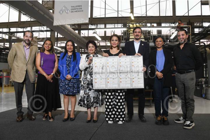 CIUDAD DE MÉXICO, 03MAYO2024.- Maribel Aguilera Cháirez, directora de Talleres Gráficos de México, y Patricia Avendaño Durán, consejera presidente del Instituto Electoral de la Ciudad de México (IECM), junto a las consejeros electorales del IECM: Sonia Pérez Pérez y Erika Estrada Ruiz; Ernesto Ramos Mega, Mauricio Huesca Rodríguez y Bernardo Valle Monroy, y Norma Irene de la Cruz Magaña, consejera del Instituto Nacional Electoral (INE), encabezaron el inicio de la impresión de 24 millones 886 mil 209 boletas electorales que serán repartidas para el proceso electoral de la Jefatura de Gobierno, Alcaldías y Diputaciones al Congreso de la Ciudad de México FOTO: MARIO JASSO/CUARTOSCURO.COM