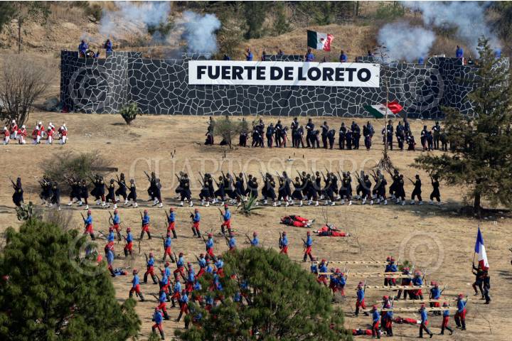 PUEBLA, PUEBLA, 06MAYO2024.- Elementos de la XXV Zona Militar realizaron la Representación de la Batalla del 5 de Mayo, por el 162 aniversario de la gesta heroica. FOTO: MIREYA NOVO/ CUARTOSCURO.COM