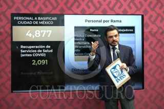 CIUDAD DE MÉXICO, 09MAYO2024.- El Jefe de Gobierno, Martí Batres Guadarrama; el director general del Instituto Mexicano del Seguro Social (IMSS), Zoé Robledo Aburto, y el director general del IMSS-BIENESTAR, Alejandro Antonio Calderón Alipi, informaron que este mes se va a concretar la basificación de 4 mil 877 trabajadoras y trabajadores de la salud, gracias a la incorporación de la Ciudad de México a los Servicios de Salud IMSS-BIENESTAR. Se suman a las 6 mil 059 personas basificadas en una primera etapa y a 173 médicas y médicos especialistas contratados por convocatoria, lo que da un total de 11 mil 109 integrantes que ya cuentan con una plaza. “Este proceso de basificación ha venido beneficiando a cada vez más personas, a un segmento cada vez más amplio del personal de salud en la Ciudad de México, (…) es muy buena información para los trabajadores de la salud y por supuesto para los servicios de salud, porque la estabilidad en el empleo, la mejora de las condiciones, la mejora salarial, por supuesto que ayuda a mejorar el servicio para usuarios y derechohabientes en los Servicios de Salud Pública”, aseguró el Jefe de Gobierno. FOTO: IMSS/CUARTOSCURO.COM