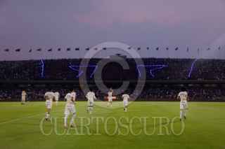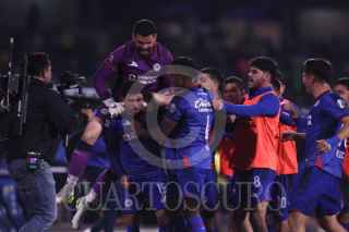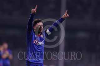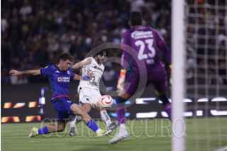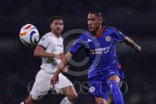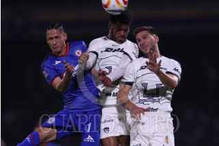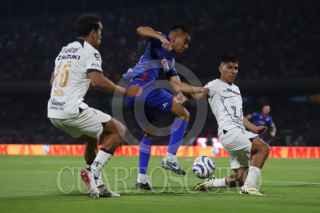CIUDAD DE MÉXICO, 09MAYO2024. Uriel Antuna de la Máquina Celeste, José Caicedo y Lisandro Magallan de Pumas disputan una pelota durante el partido de fútbol de ida, Pumas vs Cruz Azul correspondiente a la fase de cuartos de final del Torneo Clausura 2024 de Liga BBVA MX, en el Estadio Olímpico Universitario. FOTO: EDGAR NEGRETE LIRA/CUARTOSCURO.COM