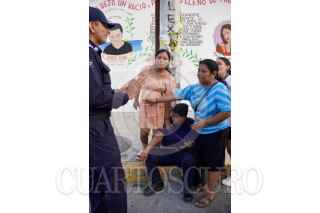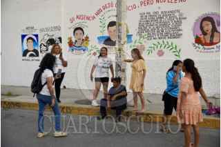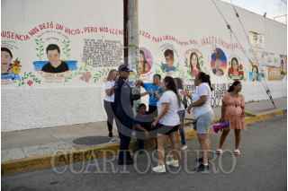 CANCÚN, QUINTANA ROO, 10MAYO2024.- Madres buscadoras detuvieron y amarraron a una oficial luego de que violara una valla donde ellas se encontraban realizando un mural en la Fiscalía General de Estado de Quintana Roo, sobre la avenida Xcaret con esquina avenida Kabah; las mujeres comentaron que la policía fue grosera e irrespetuosa. FOTO: ELIZABETH RUÍZ/CUARTOSCURO.COM