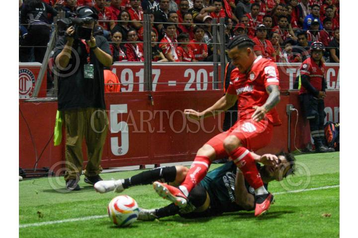 TOLUCA, ESTADO DE MÉXICO, 11MAYO2024.- Maximiliano Araujo delantero de los Diablos de Toluca y Alan Mozo defensa de las Chivas de Guadalajara partido de vuelta de Cuartos de Final del clausura 2024, el encuentro tuvo un marcador final 0-0, global 0-1, consiguiendo las Chivas de Guadalajara su pase como segundo semifinalista de la Liguilla Liga MX. FOTO: CRISANTA ESPINOSA AGUILAR /CUARTOSCURO.COM