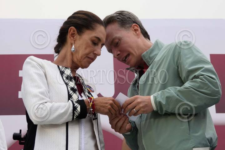 CIUDAD DE MÉXICO, 13MAYO2024.- Claudia Sheinbaum, candidata a la presidencia por la coalición "Sigamos haciendo Historia", y Manuel Velasco, coordinador de Alianzas, durante un mitin en la Utopía Meyehualco, alcaldía Iztapalapa. FOTO: GRACIELA LÓPEZ /CUARTOSCURO.COM