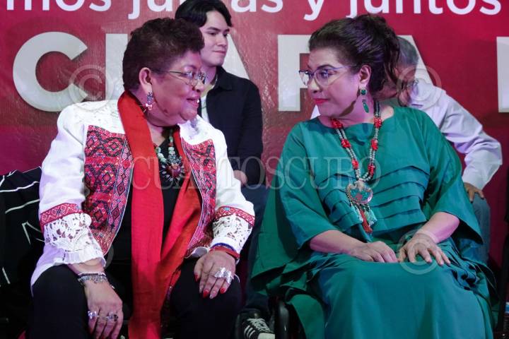 CIUDAD DE MÉXICO, 14MAYO2024.- Clara Brugada, candidata a la Jefatura de Gobierno, acompañada de Ernestina Godoy, candidata a senadora, encabezó un encuentro con integrantes de la CNPA “Es tiempo de mujeres” en Plaza 23 de Mayo, Centro Histórico. FOTO: GRACIELA LÓPEZ /CUARTOSCURO.COM