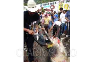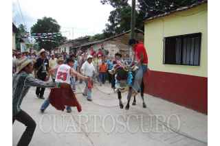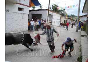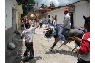 MOCHILAN, GUERRERO, 24JULIO2007.- Aspecto general del tradicional "Paseo del Toro", donde son soltados varios becerros, vaquillas y toros, por las principales calles de la poblacion de Mochitlan, donde son montados y toreados por la poblacion, esto como parte de las festividades en honor a nuestra señora Santa Ana, los cuales al final del recorrido son sacrificados. FOTO: OSCAR ALVARADO/CUARTOSCURO.COM