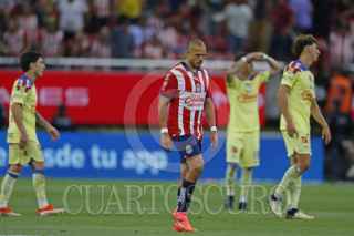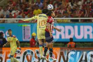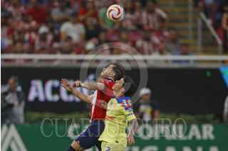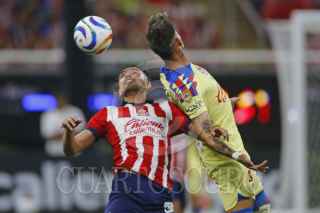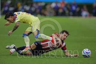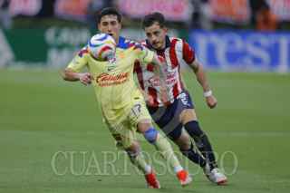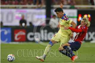 ZAPOPAN, JALISCO, 15MAYO2024.-Isrrael Reyes jugador de Chivas, disputa el balón con el contrario de América, Fernando Beltrán, esto en partido correspondiente a la Semifinal de Ida del Torneo Clausura 2024 de la Liga MX, en donde se enfrentan los equipos de Chivas vs América, en juego que se lleva a cabo en el Estadio Akron, el marcador al momento es 0-0. FOTO: FERNANDO CARRANZA GARCIA / CUARTOSCURO.COM