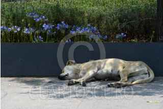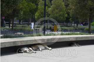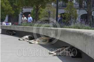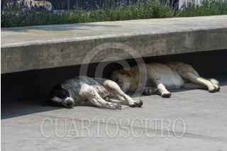 TOLUCA, ESTADO DE MÉXICO, 16MAYO2024.- Ante las altas temperaturas que se registran en el Valle de Toluca perros de la calle buscan sombra en algunos espacios públicos como la Plaza de los Mártires y toman un descanso en partes frescas. FOTO: CRISANTA ESPINOSA AGUILAR /CUARTOSCURO.COM