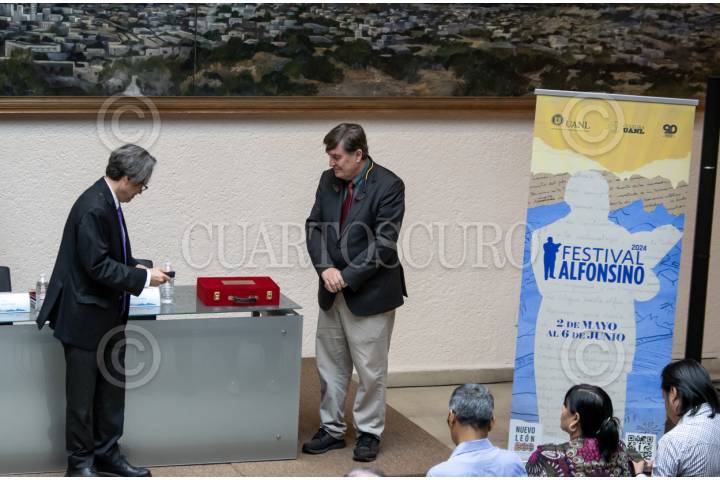 SAN NICOLÁS DE LOS GARZA, 17MAYO2024.- La Caja de las Letras recibió de manos del Rector de la Universidad Autónoma de Nuevo León, Santos Guzmán López, el legado "In Memoriam" del escritor Alfonso Reyes (Monterrey 1889 - Cd. de México 1959) a García Montero para guardarlo posteriormente en la institución de Madrid, España. El acto se celebró en la Capilla Alfonsina de la UANL, en el marco del 135º aniversario del nacimiento del escritor y diplomático regiomontano Alfonso Reyes. FOTO: GABRIELA PÉREZ MONTIEL / CUARTOSCURO.COM