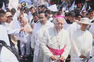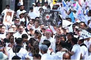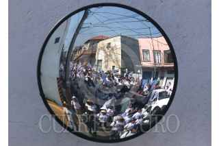 CUERNAVACA, MORELOS, 18MAYO2024.- Reflejo en un espejo circular de miles de católicos que participaron en la décima "Caminata por la Paz", convocada por Ramon Castro, obispo de la Diócesis de Cuernavaca, para exigir atención a los gobernantes y sociedad ante el estado de violencia que padece la entidad. Ramon Castro, también secretario general de la Conferencia del Episcopado Mexicano, declaro que "el crimen organizado está tratando de organizar e influir en las elecciones, eso todo mundo lo sabe. Está buscando a un sector del pueblo a votar por algunos partidos". FOTO: MARGARITO PÉREZ RETANA/CUARTOSCURO.COM