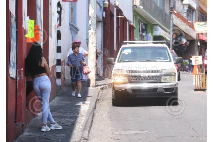 CUERNAVACA, MORELOS, 18MAYO2024.- Vida cotidiana en la calle Aragón y León en el centro histórico de la capital; esta calle es reconocida como lugar donde se ejerce la prostitución y venta de drogas. En la imagen una prostituta (de espaldas a la cámara) espera clientes fuera de un hotel en la calle referida. FOTO: MARGARITO PÉREZ RETANA/CUARTOSCURO.COM