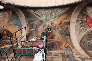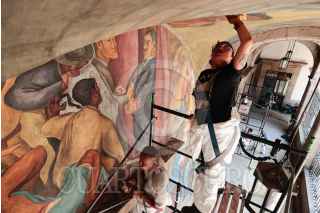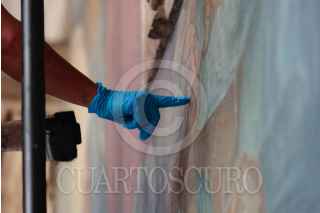 CIUDAD DE MÉXICO, 21MAYO2024.- La Secretaría de Cultura federal y el Instituto Nacional de Bellas Artes y Literatura (Inbal), en colaboración con el Gobierno de la Ciudad de México, mediante la Secretaría de Desarrollo Urbano y Vivienda, iniciaron los trabajos de restauración de tres murales de Pablo O’Higgins, Juan Campos W y Antonio Pujol que se encuentran en el Teatro del Pueblo, en República de Venezuela 72, en el Centro Histórico, labor que tiene como objetivo preservar el patrimonio artístico y cultural que existe en la capital. Se trata de La lucha de los obreros contra los monopolios, de O’Higgins; Danzas populares. Historia del teatro en México, del pintor Campos W, y Los alimentos y el problema del obrero, de Pujol, murales que datan de 1934, cuando abrió sus puertas el Teatro del Pueblo y que con los años presentaron deterioro por humedad, polvo en superficie, desprendimientos parciales, pérdida de tonalidad y afloraciones salinas. FOTO: SECRETARIA DE CULTURA/CUARTOSCURO.COM