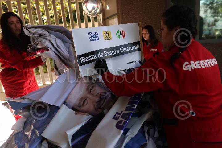 CIUDAD DE MÉXICO, 22MAYO2024.- El día de ayer activistas de Greenpeace México devolvieron en las sede del Partido Acción Nacional (PAN) pendones y lonas de propaganda electoral recogidos de puentes peatonales, postes y camellones de la Ciudad de México. Durante la acción desplegaron el mensaje "La basura electoral es una mala elección". FOTO: GREENPEACE/GUSTAVO GRAF/CUARTOSCURO.COM