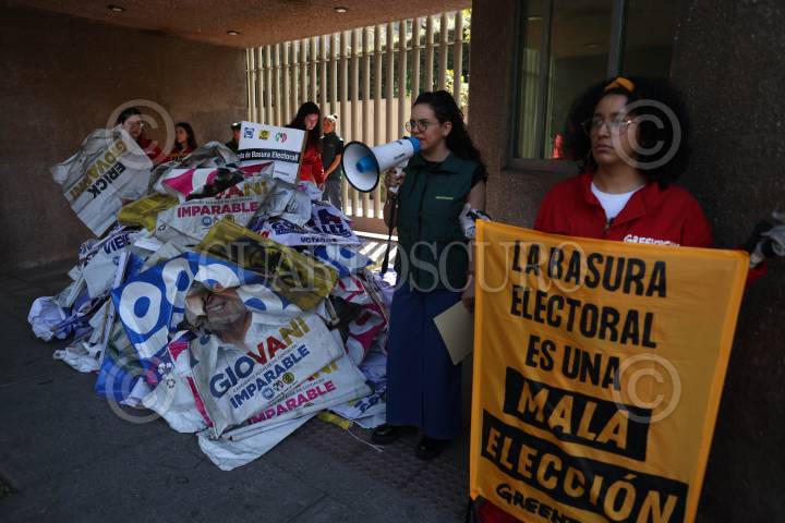 CIUDAD DE MÉXICO, 22MAYO2024.- El día de ayer activistas de Greenpeace México devolvieron en las sede del Partido Acción Nacional (PAN) pendones y lonas de propaganda electoral recogidos de puentes peatonales, postes y camellones de la Ciudad de México. Durante la acción desplegaron el mensaje "La basura electoral es una mala elección". FOTO: GREENPEACE/GUSTAVO GRAF/CUARTOSCURO.COM