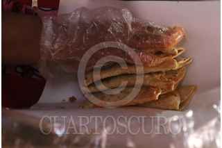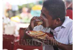 CUERNAVACA, MORELOS, 23MAYO2024.- Un hombre come un taco de canasta en el mercado Adolfo López Mateos. Los tacos de canasta son una popular preparación que consiste en tortillas rellenas de diversos guisados, usualmente papa, chicharrón, frijoles o adobo, y bañadas en aceite o manteca derretida. Son originarios de San Vicente Xiloxochitla, Tlaxcala, pero se consumen en todo el centro del país. FOTO: MARGARITO PÉREZ RETANA/CUARTOSCURO.COM