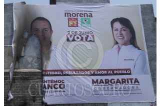 CUERNAVACA, MORELOS, 24MAYO2024.- En las calles de la entidad existe muy poca propaganda electoral de la coalición "Sigamos haciendo historia en Morelos" (MORENA, PVEM y PT) donde se publiciten la candidata a la gubernatura Margarita González Saravia y el gobernador con licencia, Cuauhtémoc Blanco Bravo, candidato propietario a una diputación federal de representación proporcional. En una calle de la colonia Lagunilla, al poniente de la capital se puede observar una gran manta espectacular donde se promocionan los dos políticos. Hoy se constató que volvieron a prenderle fuego, quemando casi por completo la foto del exfutbolista. FOTO: MARGARITO PÉREZ RETANA/CUARTOSCURO.COM