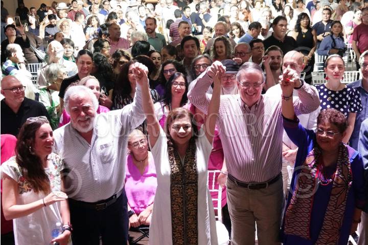 CIUDAD DE MÉXICO, 26MAYO2024.- Clara Brugada, candidata a Jefa de Gobierno, acompañada de Alejandro Encinas, coordinador de campaña; Marcelo Ebrard, ex secretario de Relaciones Exteriores, y Ernestina Godoy, candidata a senadora, durante el evento "Las Ideas y Causas con Clara Brugada" en el Centro Cultural Indianilla. FOTO: GRACIELA LÓPEZ /CUARTOSCURO.COM