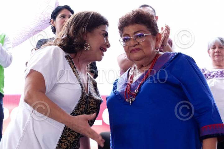 CIUDAD DE MÉXICO, 26MAYO2024.- Clara Brugada, candidata a la Jefatura de Gobierno, y Ernestina Godoy, candidata a senadora, conversaron durante el cierre de campaña de Nancy Nuñez, candidata a la alcaldía de Azcapotzalco, realizado en la explanada de esta demarcación. FOTO: GRACIELA LÓPEZ /CUARTOSCURO.COM