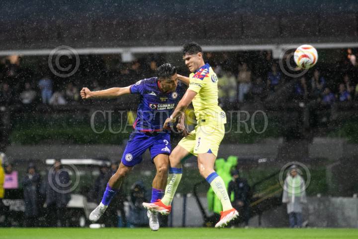 CIUDAD DE MÉXICO, 26MAYO2024.- Ángel Sepúlveda, delantero del Cruz Azul, remata el balón ante el asedio de Israel Reyes del América, durante la final de la Liga MX, en el Estadio Azteca. Las Águilas se impusieron 1-0 a la Máquina, en la final de la Liga MX, con esto los de Coapa se coronan como Bicampeones. FOTO: MOISÉS PABLO/CUARTOSCURO.COM