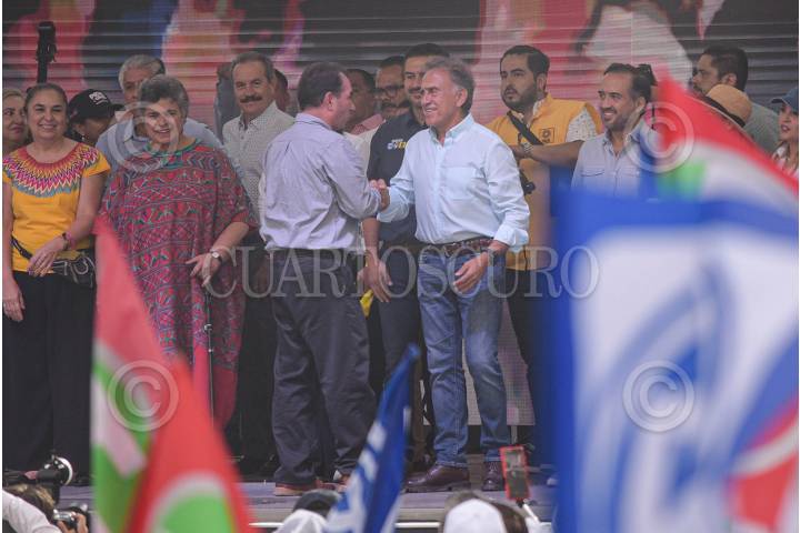 XALAPA, VERACRUZ, 29MAYO2024.- José Yunes Zorrilla, candidato a la gubernatura de Veracruz, saluda Miguel Ángel Yunes Linares, ex gobernador de Veracruz, durante su cierre de campaña en el estadio Ferrocarrilero de Xalapa. FOTO: YERANIA ROLÓN/CUARTOSCURO.COM