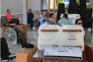 VILLAHERMOSA, TABASCO, 02JUNIO2024.- La ausencia de funcionarios electorales ha provocado retrasos en la instalación de casillas en algunas secciones de la ciudad de Villahermosa. Con abanicos, paraguas, sombreros y gorras, decenas de habitantes hacen fila en una casilla especial en la ciudad de Villahermosa. Un millón 811 mil 505 ciudadanos con credencial para votar participan en uno de los comicios más grandes de la historia nacional. FOTO: LUIS LÓPEZ/CUARTOSCURO.COM