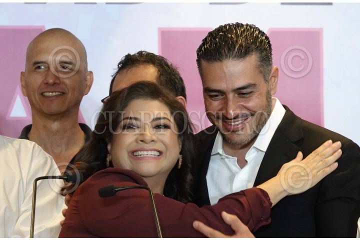 CIUDAD DE MÉXICO, 02JUNIO2024.- Clara Brugada, candidata a Jefa de Gobierno por la coalición "Sigamos haciendo Historia", y Omar García Harfuch, candidato a senador, se saludaron durante una conferencia en la que se anunció como ganadora en las Encuestas. El acto se realizó en el Hotel Barceló. FOTO: GRACIELA LÓPEZ /CUARTOSCURO.COM