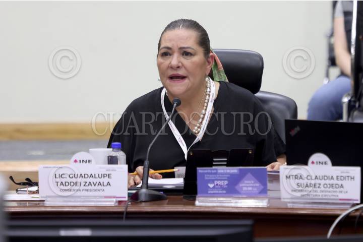 CIUDAD DE MÉXICO, 03JUNIO2024. Guadalupe Taddei Zavala durante la clausura de la Sesión Extraordinaria del Consejo General del INE, con motivo de la Jornada Electoral 2024 tras dar a conocer las tendencias de la elección a la presidencia, las senadurías y diputaciones. FOTO: EDGAR NEGRETE LIRA/CUARTOSCURO.COM