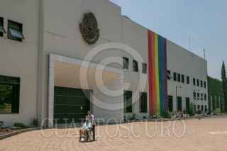 CIUDAD DE MÉXICO, 06JUNIO2024.- Bandera de la comunidad LGBTIQ+ fue colocada en la fachada del Complejo Cultural Los Pinos, en el marco de los actos conmemorativos del mes del orgullo gay. FOTO: MOISÉS PABLO/CUARTOSCURO.COM