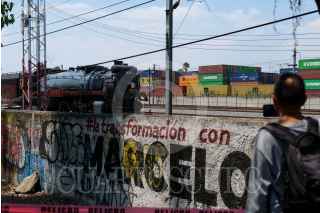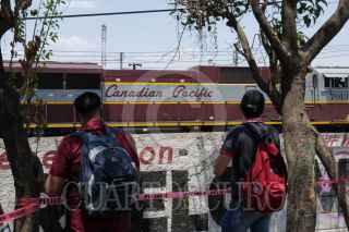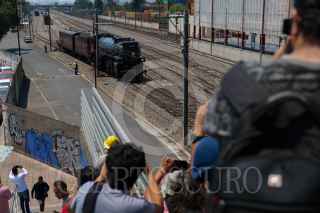 CIUDAD DE MÉXICO, 06JUNIO2024.- Dos personas miran la llegada de la Locomotora Emperatriz 2816 que fue restaurada por la empresa Canadian Pacific Kanzas City Limited, después de haber realizado un recorrido por Canadá, Estados Unidos y México. FOTO: ALICE MORITZ/CUARTOSCURO.COM