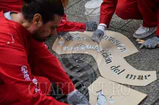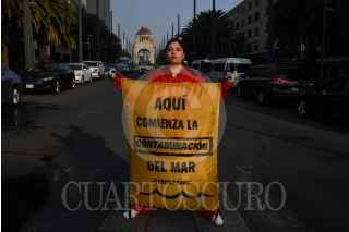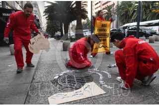 CIUDAD DE MÉXICO, 07JUNIO2024.- Activistas de la organización "Greenpeace México" colocaron en los alrededores de las alcantarillas públicas que rodean la Plaza de la República la frase "Aquí comienza la contaminación del mar" con pintura biodegradable. Esto con la intención de mostrar a la ciudadanía la importancia de actuar por Océanos sin plásticos, en el marco del día mundial de los océanos. FOTO: MARIO JASSO/CUARTOSCURO.COM
