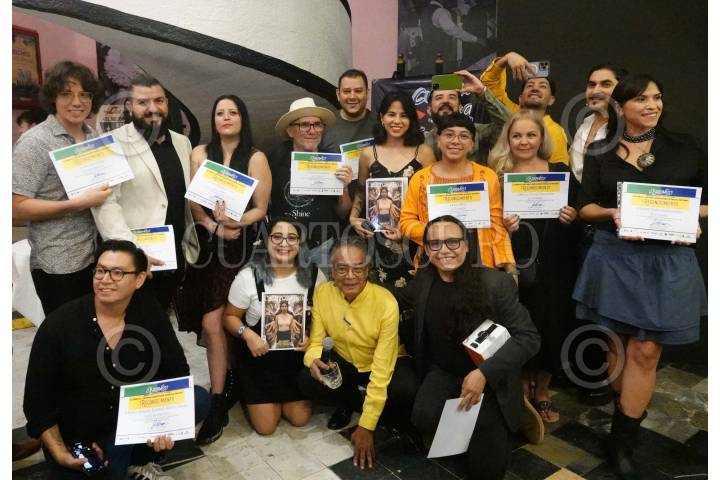 CIUDAD DE MÉXICO, 09JUNIO2024.- Pedro Valtierra, director de la Revista y Agencia Cuartoscuro, acompañado de los ganadores del Concurso de Fotografía Latinoamericano de Fotografía Cuartoscuro 2024 ¿Bailamos?, durante la entrega de reconocimientos a los ganadores en el Salón Los Ángeles. FOTO: GRACIELA LÓPEZ /CUARTOSCURO.COM