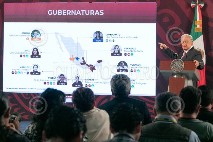 CIUDAD DE MÉXICO, 10JUNIO2024.- Andrés Manuel López Obrador, Presidente de México, mostró los resultados electorales de la jornada electoral tras finalizar los cómputos de los votos. Mostró gráficas de los resultados de la elección a Presidente de la República, Senadores, Diputados Federales y gubernaturas. Criticó que casas encuestadora vendan sus resultados al mejor postor, ya que algunas de ellas mostraban arriba a la candidata presidencial de la coalición Fuerza y Corazón por México, cuando el resultado oficial indica que la candidata de Morena ganó por más de 30 puntos con respecto al segundo lugar. FOTO: MOISÉS PABLO/CUARTOSCURO.COM