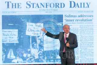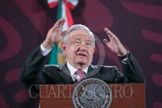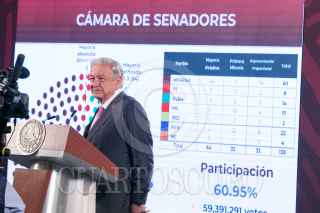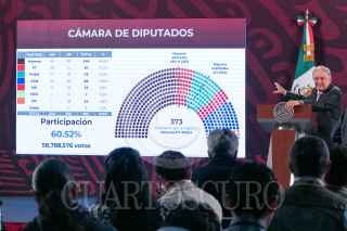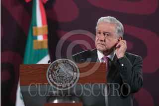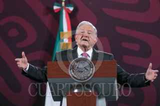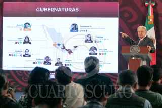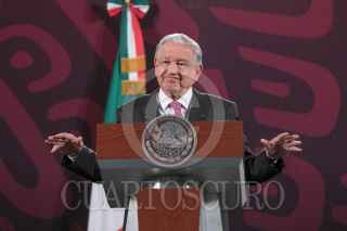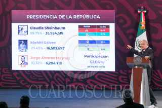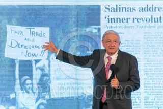 CIUDAD DE MÉXICO, 10JUNIO2024.- Andrés Manuel López Obrador, Presidente de México, muestra foto que publicada el 1 de Octubre de 1991 en el periódico estadounidense The Staford Daily, en donde se observa a Claudia Sheinbaum (Presidenta Electa) protestado en contra de las políticas del aquel entonces presidente Carlos Salinas de Gortari. FOTO: MOISÉS PABLO/CUARTOSCURO.COM