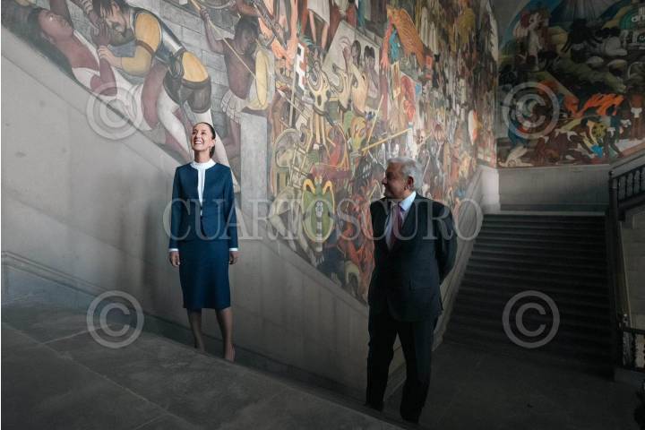 CIUDAD DE MÉXICO, 10JUNIO2014.- Claudia Sheinbaum, Presidenta Electa, observa con Andrés Manuel López Obrador, Presidente de México, los murales de Palacio Nacional, los políticos sostuvieron un encuentro para definir el proceso de transición. FOTO: CORTESÍA MORENA/CUARTOSCURO.COM