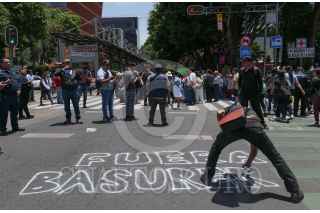 CIUDAD DE MÉXICO, 11JUNIO2024.- Un hombre pintó el suelo de la inscripción "Fuera Basurero" durante un bloqueo avenida Insurgentes frente a la Profepa. Varios protestantes se reunieron para exigir al gobierno la cancelación total del basurero de Cholula que consideran tóxico, el cual contamina el agua y sus tierras de cultivo. FOTO: ALICE MORITZ/CUARTOSCURO.COM