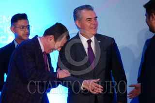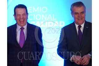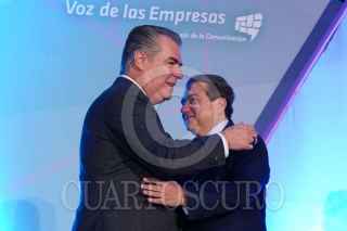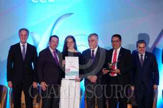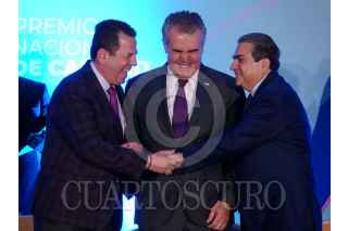 CIUDAD DE MÉXICO, 11JUNIO2024.- Francisco Cervantes Díaz, presidente de Consejo Coordinador Empresarial; Fadlala Akabai, secretario de Desarrollo Económico del Gobierno de la capital, y Roberto Moya, presidente de la Comisión de Economía en el Senado, acompañados de los ganadores del Premio Nacional de Calidad 2024 en el Club de Banqueros. FOTO: GRACIELA LÓPEZ /CUARTOSCURO.COM