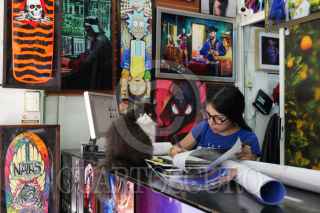 CIUDAD DE MÉXICO,12JUNIO2024.- Una mujer en una tienda de posters está esperando la llegada de clientes y dibujando en su mesa de trabajo en compañía de un gato. FOTO:ALICE MORITZ/CUARTOSCURO.COM