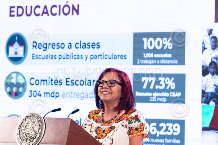 CIUDAD DE MÉXICO, 17JUNIO2024.- Leticia Ramírez, secretaria de Educación, durante su intervención en la mañanera, en la cual se habló sobre los avances de la reconstrucción de Acapulco y Coyuca de Benítez, esto a casi 300 días del paso del huracán Otis que devastó estás zonas. FOTO: MOISÉS PABLO/CUARTOSCURO.COM