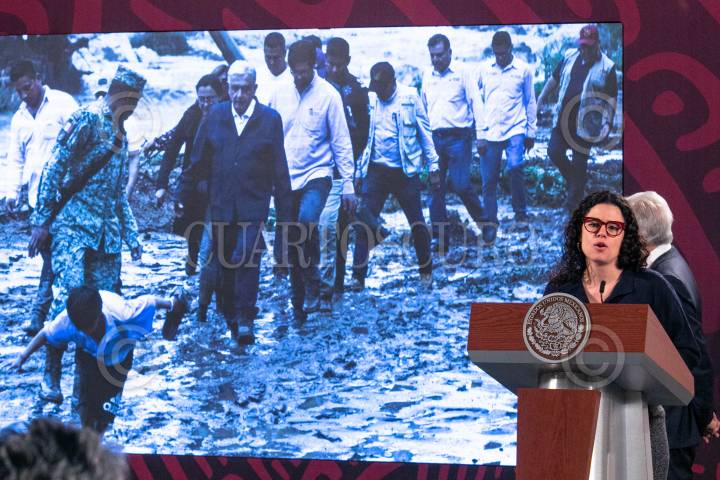 CIUDAD DE MÉXICO, 17JUNIO2024.- Luisa María Alcalde Luján, secretaria de Gobernación, muestra una foto en donde el Presidente de México, Andrés Manuel López Obrador, camina en el lodo durante su primer lo visita a Acapulco tras el paso del huracán Otis. Hoy en la mañanera se dieron avances de la reconstrucción y reactivación económica de Acapulco y Coyuca de Benítez tras varios meses del paso paso del huracán Otis que dejó una estela de destrucción en Acapulco y Coyuca de Benítez. FOTO: MOISÉS PABLO/CUARTOSCURO.COM