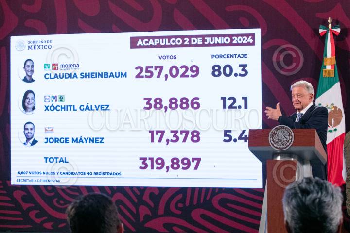 CIUDAD DE MÉXICO, 17JUNIO2024.- Andrés Manuel López Obrador, Presidente de México, muestras los resultados en la elección Presidencial en Acapulco, la gráfica señala que Claudia Sheinbaum obtuvo el 80? los sufragios, esto a varios meses del huracán Otis en Acapulco y Coyuca de Benítez, durante la mañanera. FOTO: MOISÉS PABLO/CUARTOSCURO.COM
