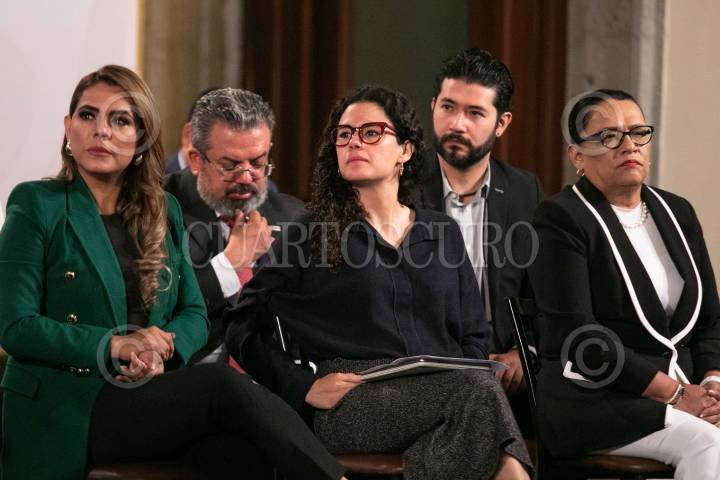 CIUDAD DE MÉXICO, 17JUNIO2024.- Evelyn Salgado, gobernadora de Guerrero; Luisa María Alcalde, secretaria de Gobernación, y Rosa Icela Rodríguez, secretaria de Seguridad, durante la mañanera en la que se habló de los avances de la reconstrucción de Acá, esto a varios meses del devastador del huracán Otis en Acapulco y Coyuca de Benítez. FOTO: MOISÉS PABLO/CUARTOSCURO.COM