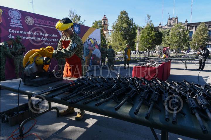 TOLUCA, ESTADO DE MÉXICO, 17JUNIO2024.- La Secretaria de la Defensa Nacional a través de la Comandancia de la 22/a Zona Militar realizó la Ceremonia de Destrucción de Armas de Fuego en coordinación con el Gobierno del Estado de México, fueron destruidas 54 armas largas y 28 armas cortas aseguradas por el Ejército Mexicano, Guardia Nacional Autoridades Policiacas del Edoméx. La ceremonia estuvo encabezada por la Gobernadora Delfina Gómez Álvarez, José Martín de la Luz comandante de la 22a Zona Militar, Horacio Duarte, Secretario General de Gobierno, Andrés Andrade Téllez, Secretario de Seguridad, José Luis Cervantes Fiscal General de Justicia del Estado de México. FOTO: CRISANTA ESPINOSA AGUILAR /CUARTOSCURO.COM