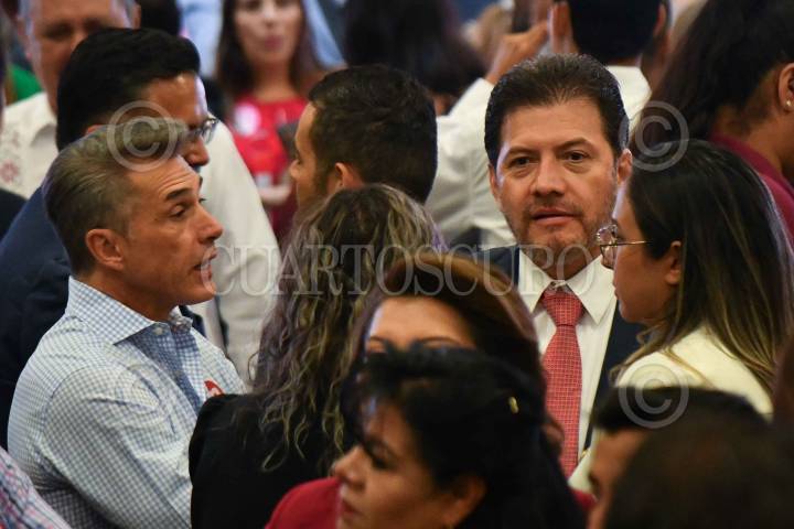 CIUDAD DE MÉXICO, 18JUNIO2024.- Sergio Mayer, y Víctor Hugo Lobo, diputados electos, durante la reunión de legisladores electos del Congreso de la Unión con Claudia Sheinbaum, virtual presidenta electa. FOTO: MARIO JASSO/CUARTOSCURO.COM
